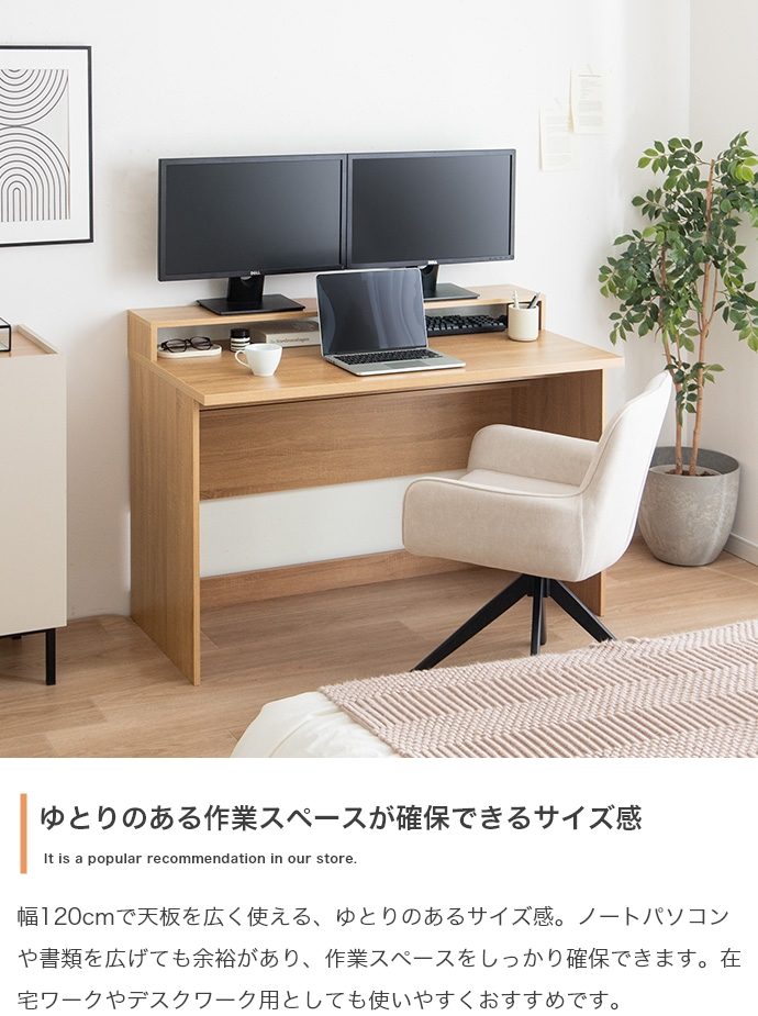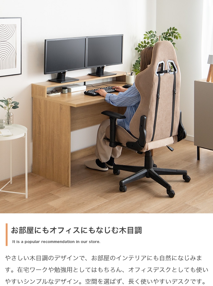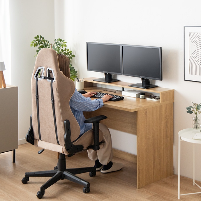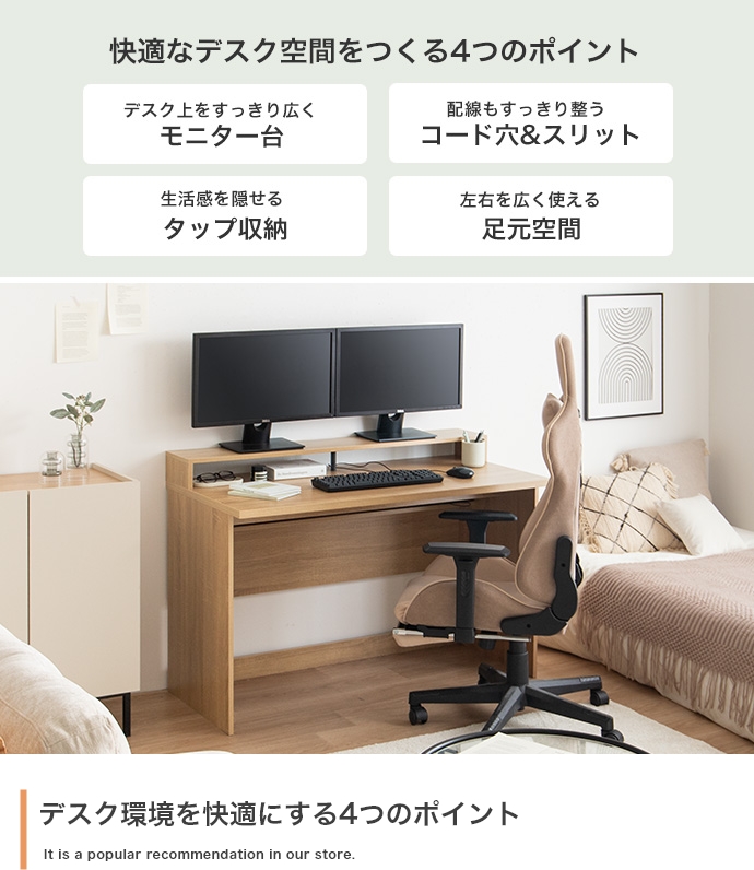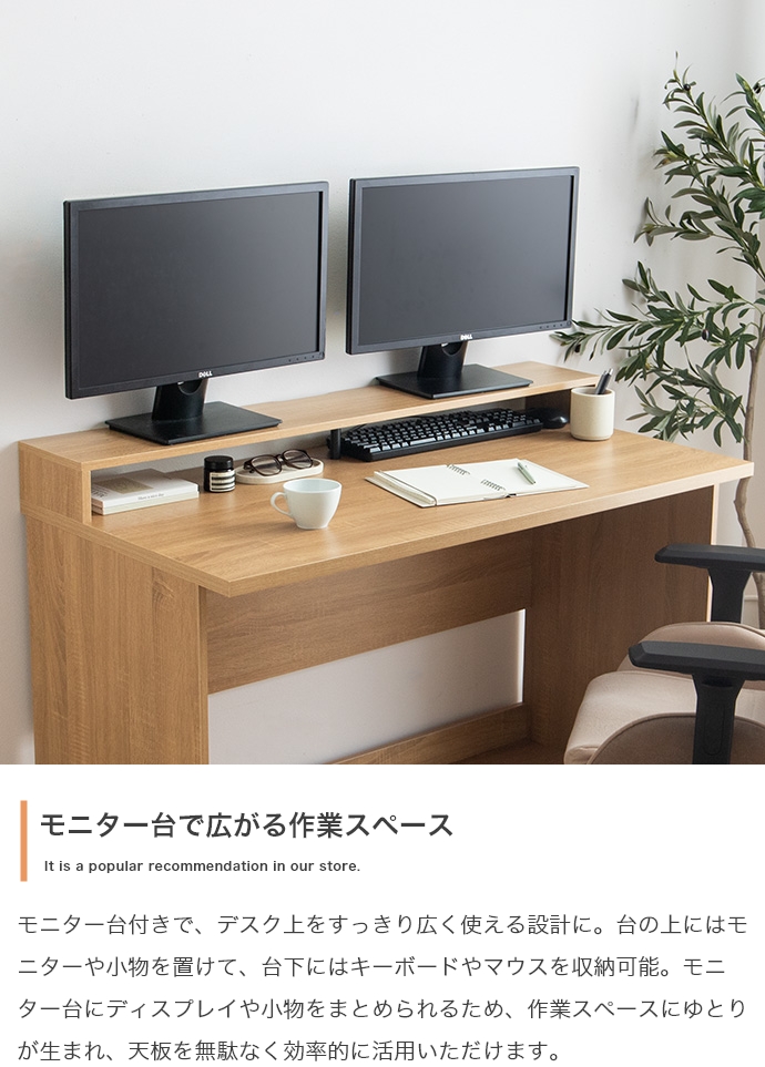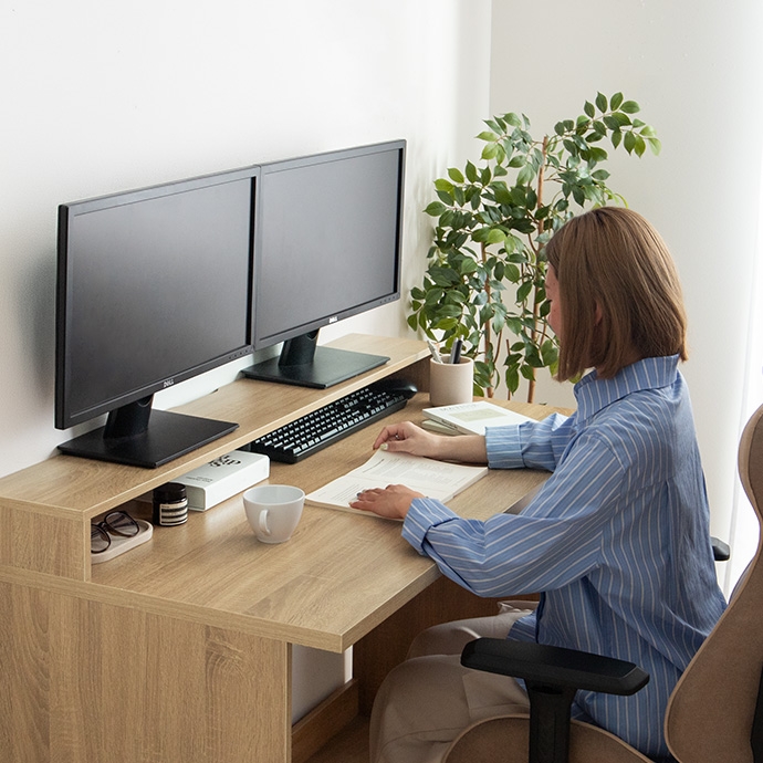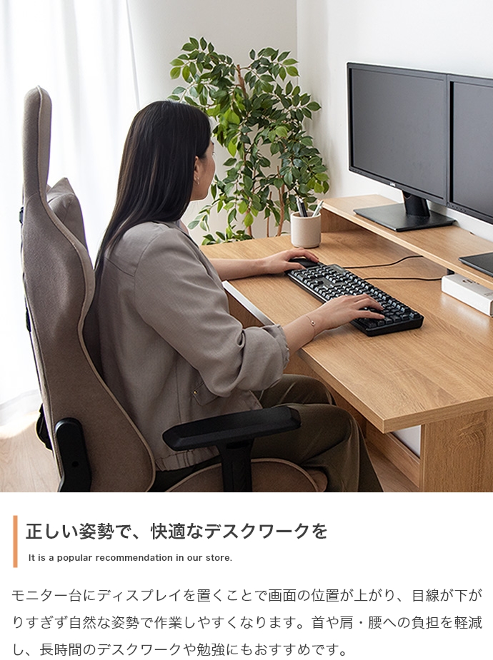 天板と同じ幅で設けたモニター台付きのデスク。モニター台があることで天板を広く使え、キーボードやノートを広げてもゆとりをもって使えます。また、モニターを目線の高さに置けるため、首や肩・腰への負担を軽減し、長時間のデスクワークや勉強も快適に。さらに配線や電源タップもすっきり収まり、デスク周りをきれいに整えられる設計です。在宅ワークや勉強、趣味の作業など、日々のデスク時間を心地よく支えます。