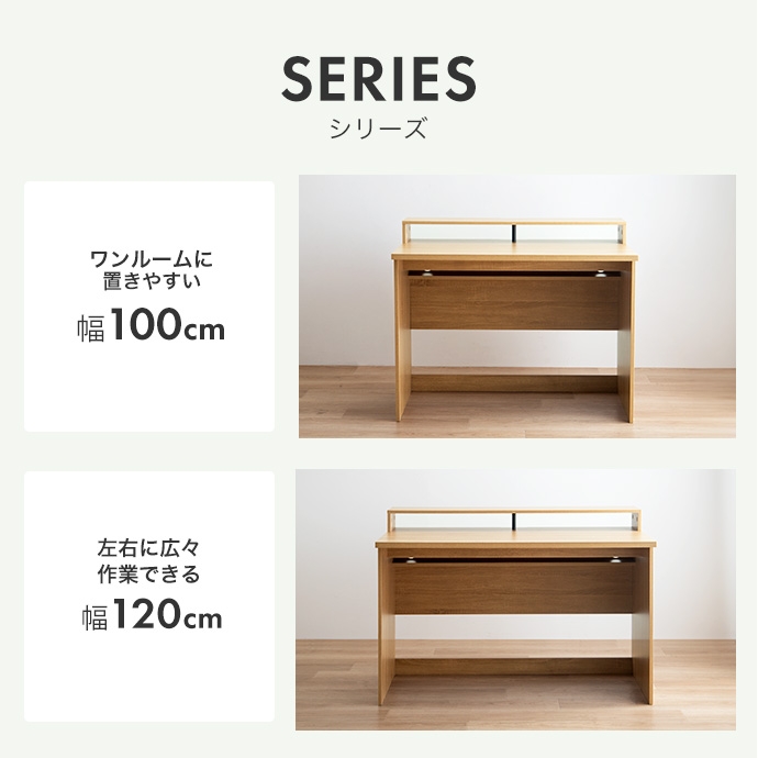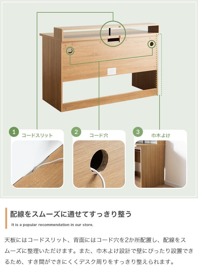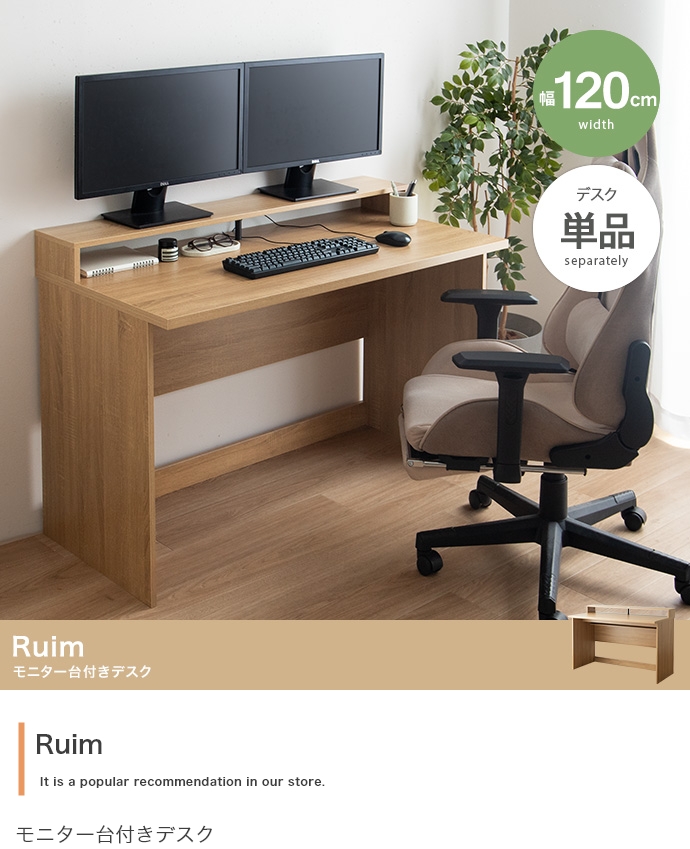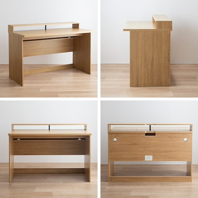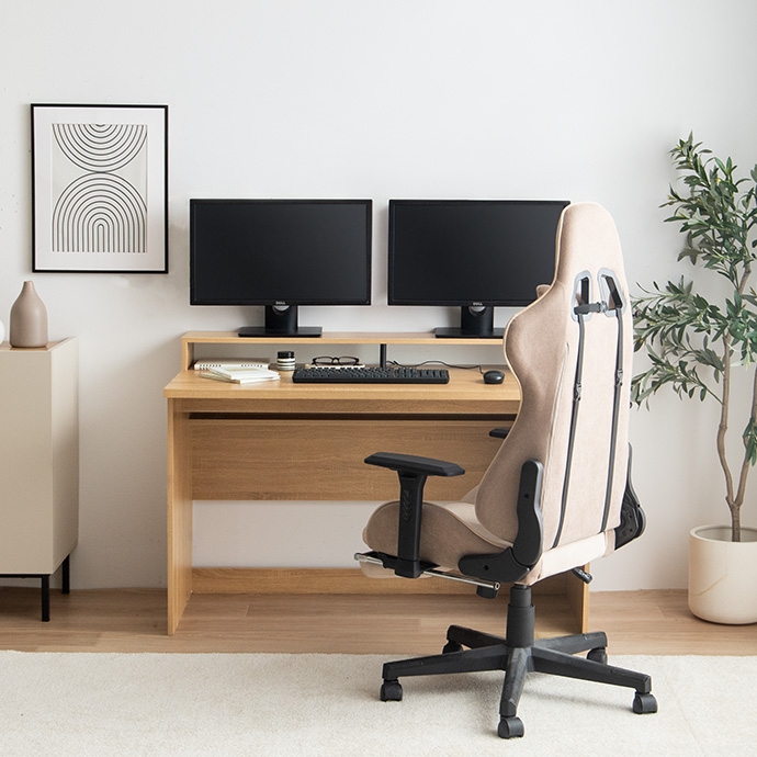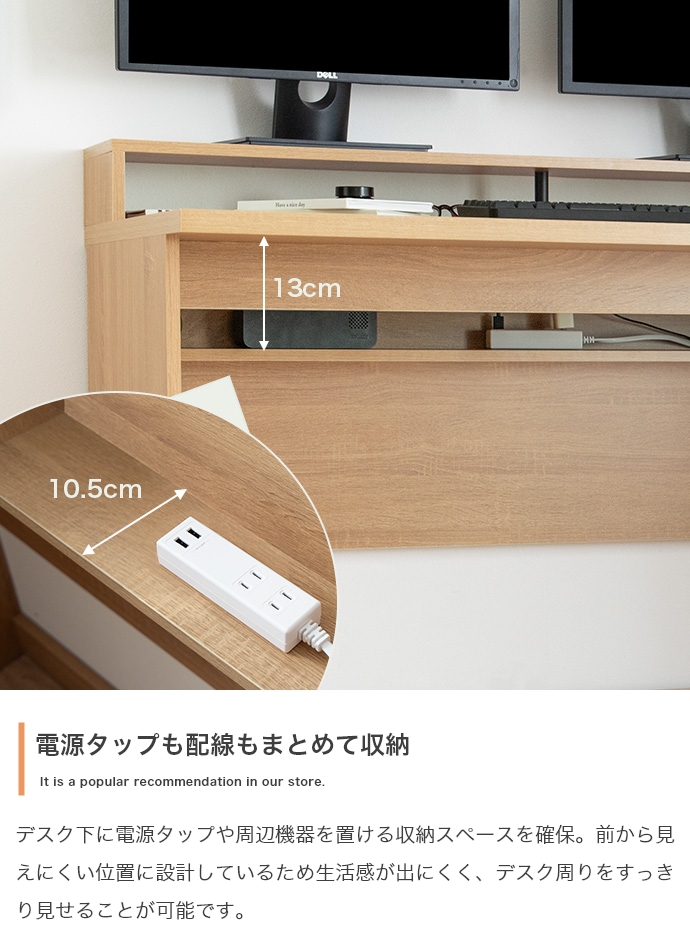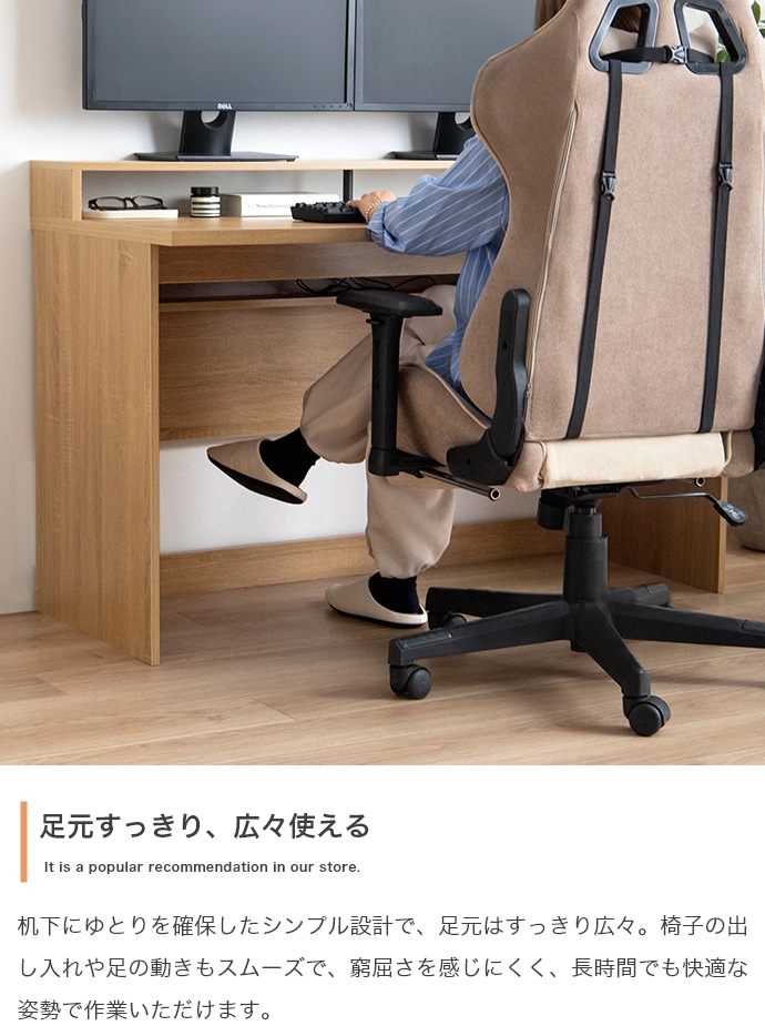 天板と同じ幅で設けたモニター台付きのデスク。モニター台があることで天板を広く使え、キーボードやノートを広げてもゆとりをもって使えます。また、モニターを目線の高さに置けるため、首や肩・腰への負担を軽減し、長時間のデスクワークや勉強も快適に。さらに配線や電源タップもすっきり収まり、デスク周りをきれいに整えられる設計です。在宅ワークや勉強、趣味の作業など、日々のデスク時間を心地よく支えます。