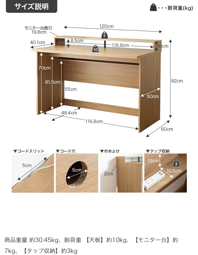 | 備考 | 【梱包サイズ】129cm×71cm×13.5cm 【梱包重量】約33.2kg 【商品重量】約30.45kg 【耐荷重】天板:約10kg、モニター台:約7kg、タップ収納:約3kg ※組み立て時間:2人以上で約45分 ※プラスドライバーをご用意ください。 |