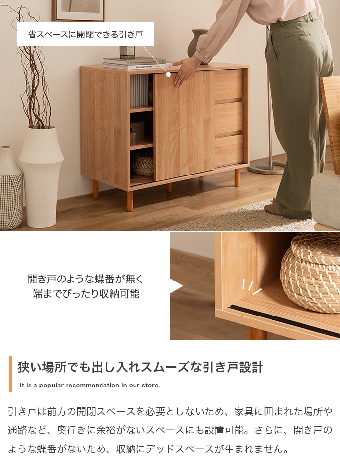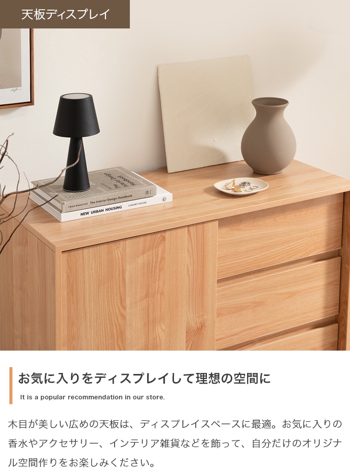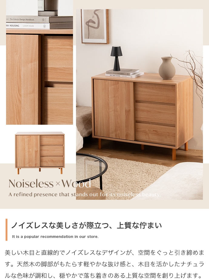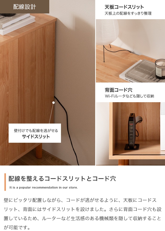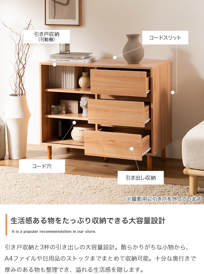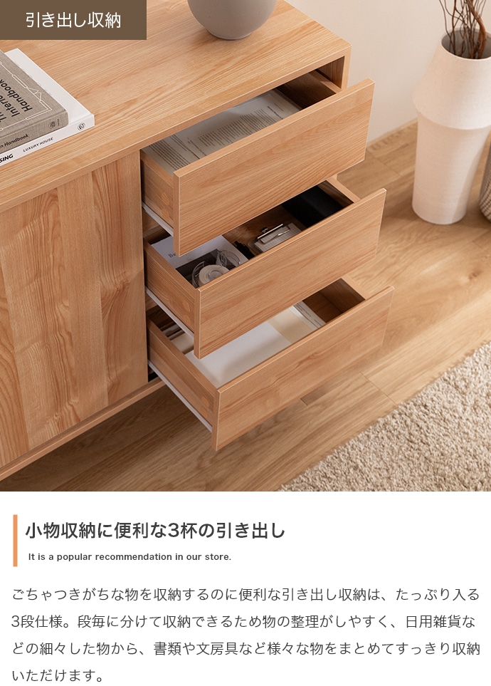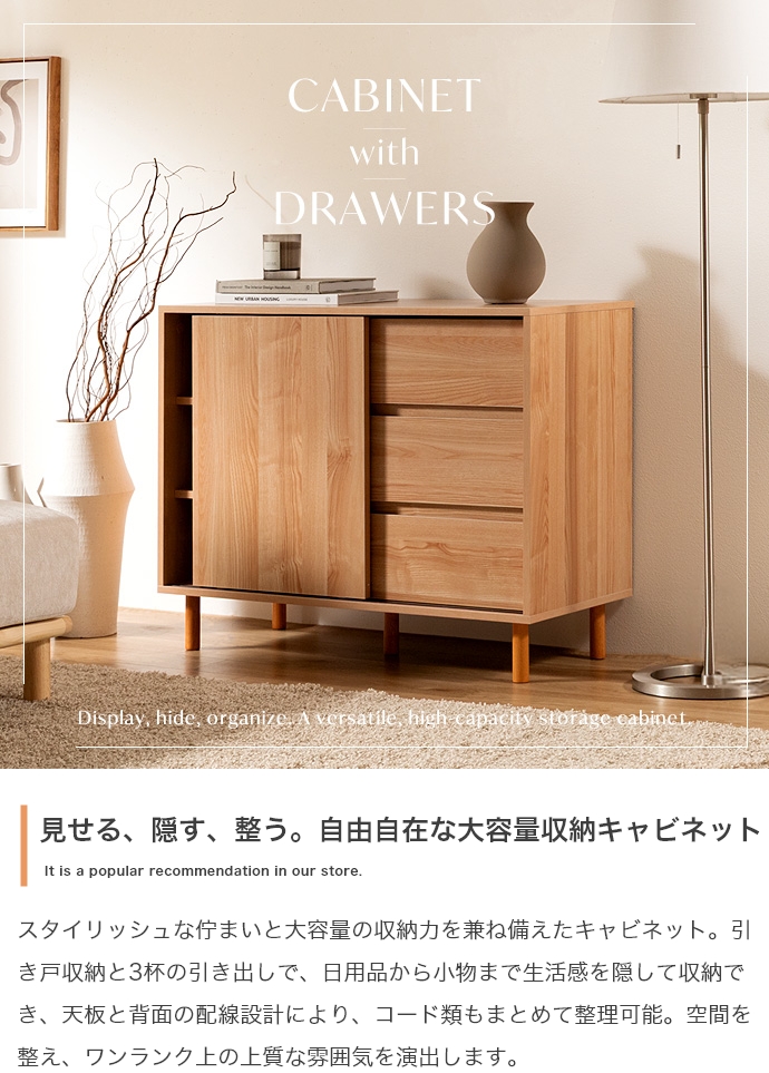 スタイリッシュな佇まいと大容量の収納力を兼ね備えたキャビネット。引き戸収納と3杯の引き出しで、日用品から小物まで生活感を隠して収納でき、天板と背面の配線設計により、コード類もまとめて整理可能。空間を整え、ワンランク上の上質な雰囲気を演出します。
