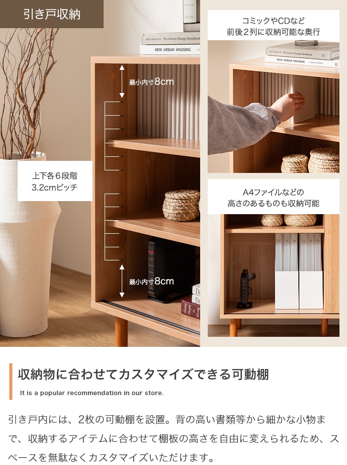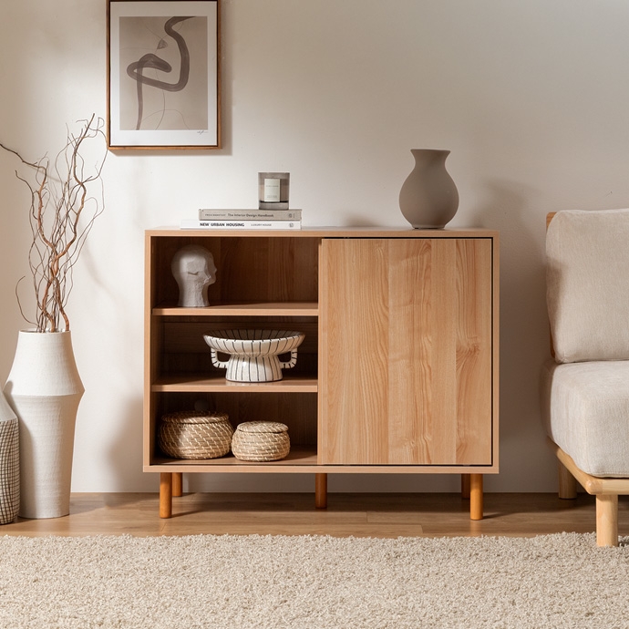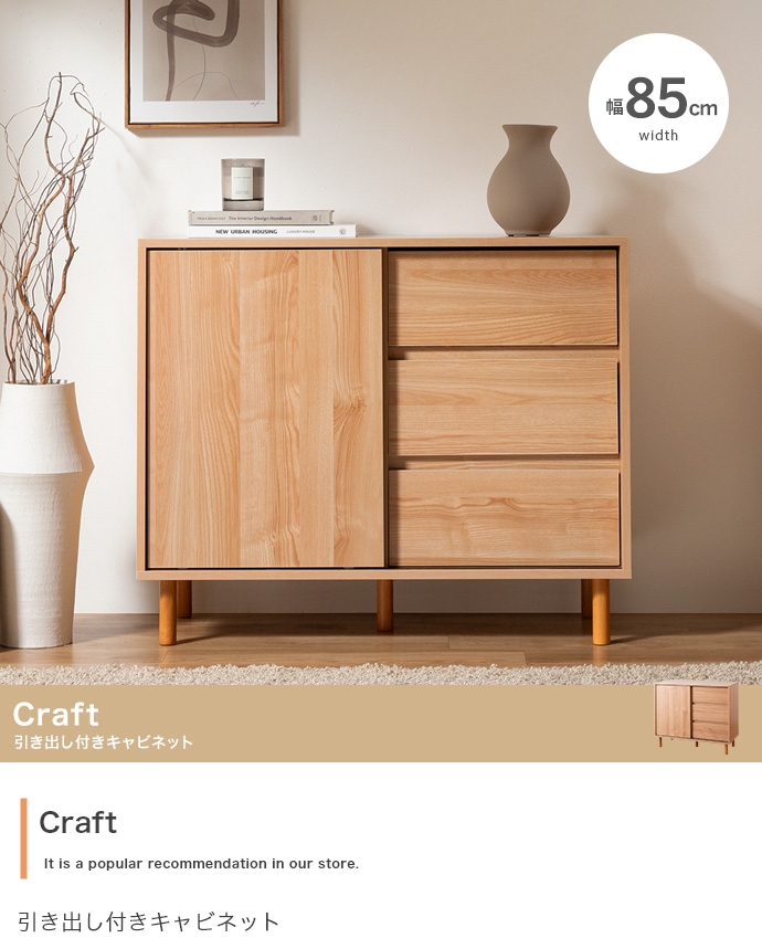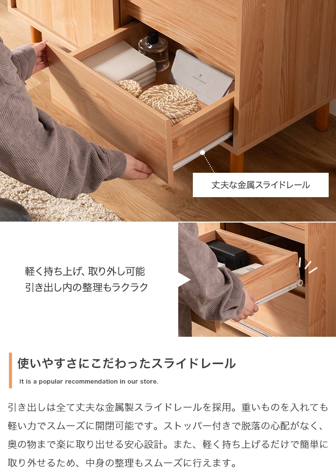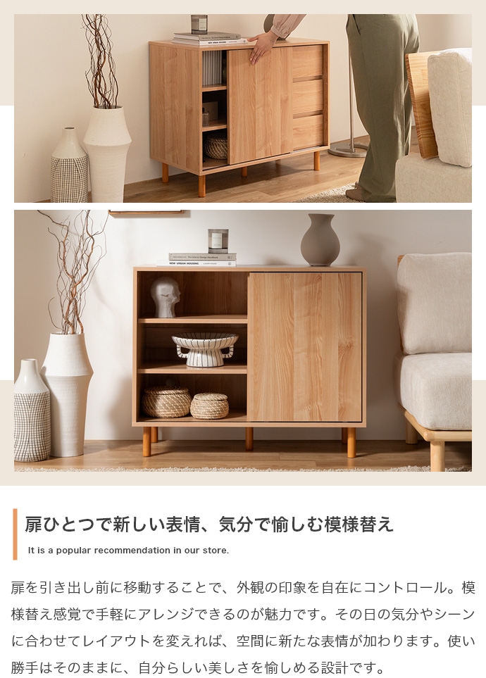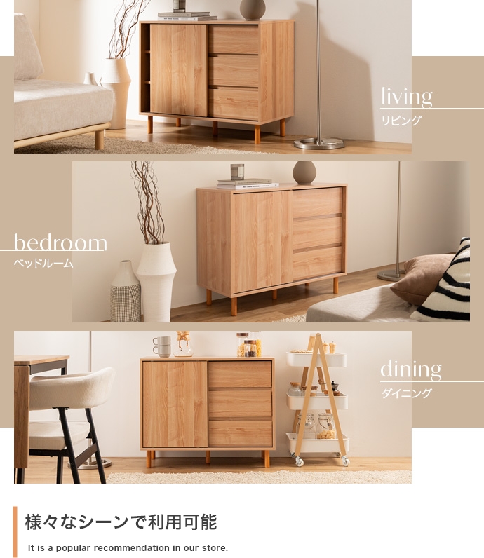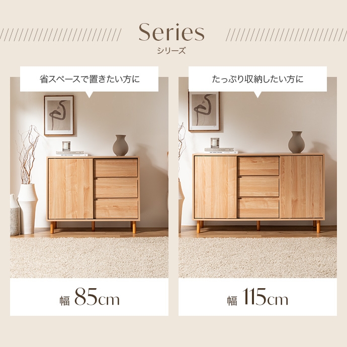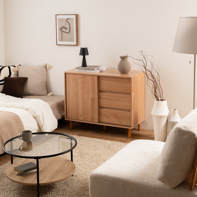スタイリッシュな佇まいと大容量の収納力を兼ね備えたキャビネット。引き戸収納と3杯の引き出しで、日用品から小物まで生活感を隠して収納でき、天板と背面の配線設計により、コード類もまとめて整理可能。空間を整え、ワンランク上の上質な雰囲気を演出します。