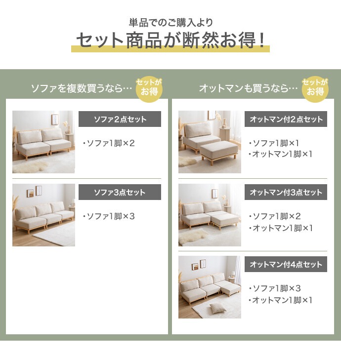 自分好みの形に自由にレイアウトできる『Ricordo(リコルド)』シリーズ。セパレートタイプで様々な置き方ができるので、お部屋の間取りやシーンに合わせて柔軟に対応します。また、天然木をふんだんに使用したフレームと優しいファブリック生地がお部屋に清潔感と明るさをもたらし、居心地のいい空間に。さらに、ポケットコイルを使用した広い座面は、程よい弾力があり長時間座っていても疲れにくく、ゆったり快適にお寛ぎいただけます。