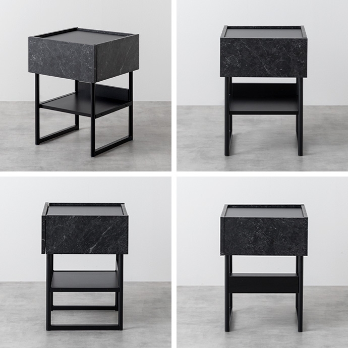大人モダンな雰囲気が特徴のサイドテーブル。直線的でシンプルな見た目ながら、引き出しとオープン棚付きでデザイン性だけでなく機能面にもこだわりました。背面も美しい仕上がりになっているので、お部屋のお好きな位置に設置可能です。ソファ横で飲み物やスマホなどを置いたり、ベッド横で時計や眼鏡を置く宮棚の代わりにしたり、様々なシーンで活用できます。