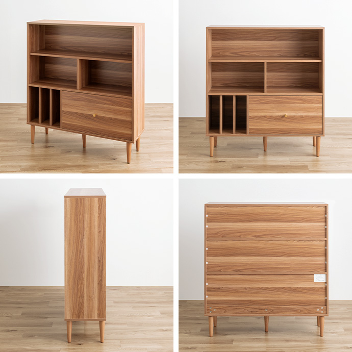 洗練された美しい空間作りができる『Lykke(ルゲ)』引き出し付き本棚。ミッドセンチュリーや北欧ヴィンテージにも最適な上質さ漂うデザインに仕上げました。収納スペースはたっぷりあり、ディスプレイはもちろん、大容量収納が可能です。またたっぷり収納できるのに、スリムなサイズ感もポイント。置くだけで雰囲気溢れる、実用的で使いやすい本棚です。